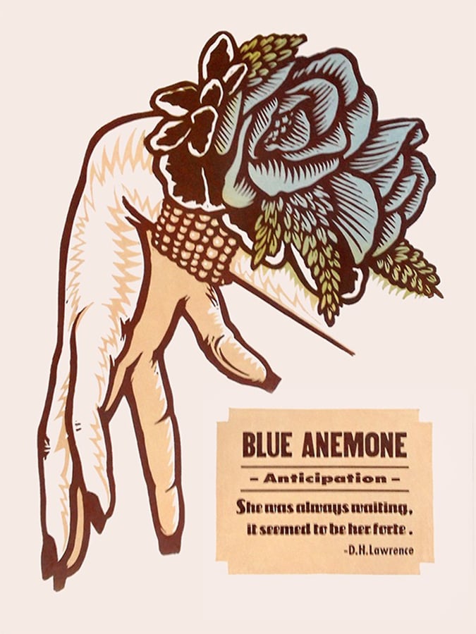 Color Woodcut and Letterpress print, 18" x 24", on French's 100 lb. Cover, Insulation Pink. Handcut, Handprinted with moveable type. Signed. Unframed. Fits in a standard size frame. Edition of 20.