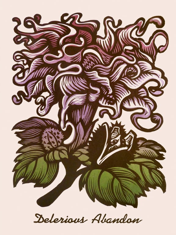 Color Woodcut and Letterpress print, 18" x 24", on French's 100 lb. Cover, Insulation Pink. Handcut, Handprinted with moveable type. Signed. Unframed. Fits in a standard size frame. Edition of 20.