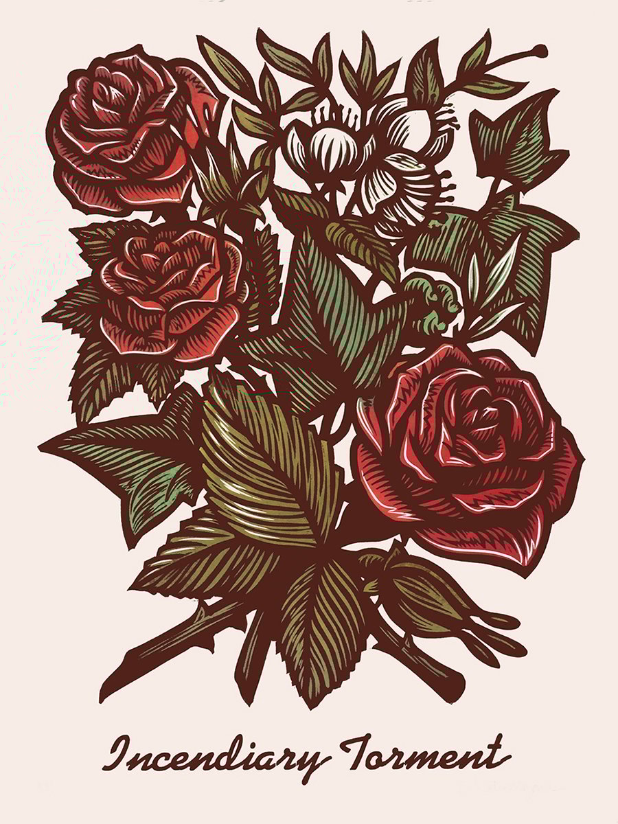 Color Woodcut and Letterpress print, 24" x 18", on French's 100 lb. Cover, Insulation Pink. Handcut, Handprinted with moveable type. Signed. Unframed. Edition of 20.