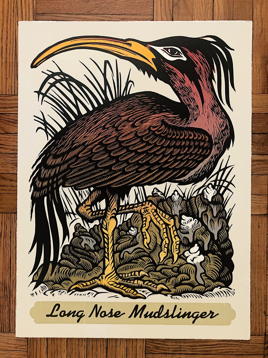 Bird Series. Color Woodcut and Letterpress print, 18" x 24", on Savoy White. Handcut, Handprinted with moveable type. Signed. Edition of 40. 2019. Unframed.