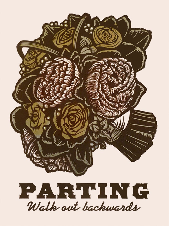 Color Woodcut and Letterpress print, 18" x 24", on French's 100 lb. Cover, Insulation Pink. Handcut, Handprinted with moveable type. Signed. Unframed. Fits in a standard size frame. Edition of 20.