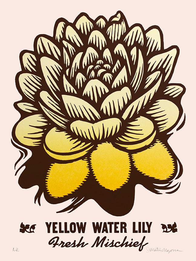 Color Woodcut and Letterpress print, 24" x 18", on French's 100 lb. Cover, Insulation Pink. Handcut, Handprinted with moveable type. Signed. Unframed. Fits in a standard size frame. Edition of 20.